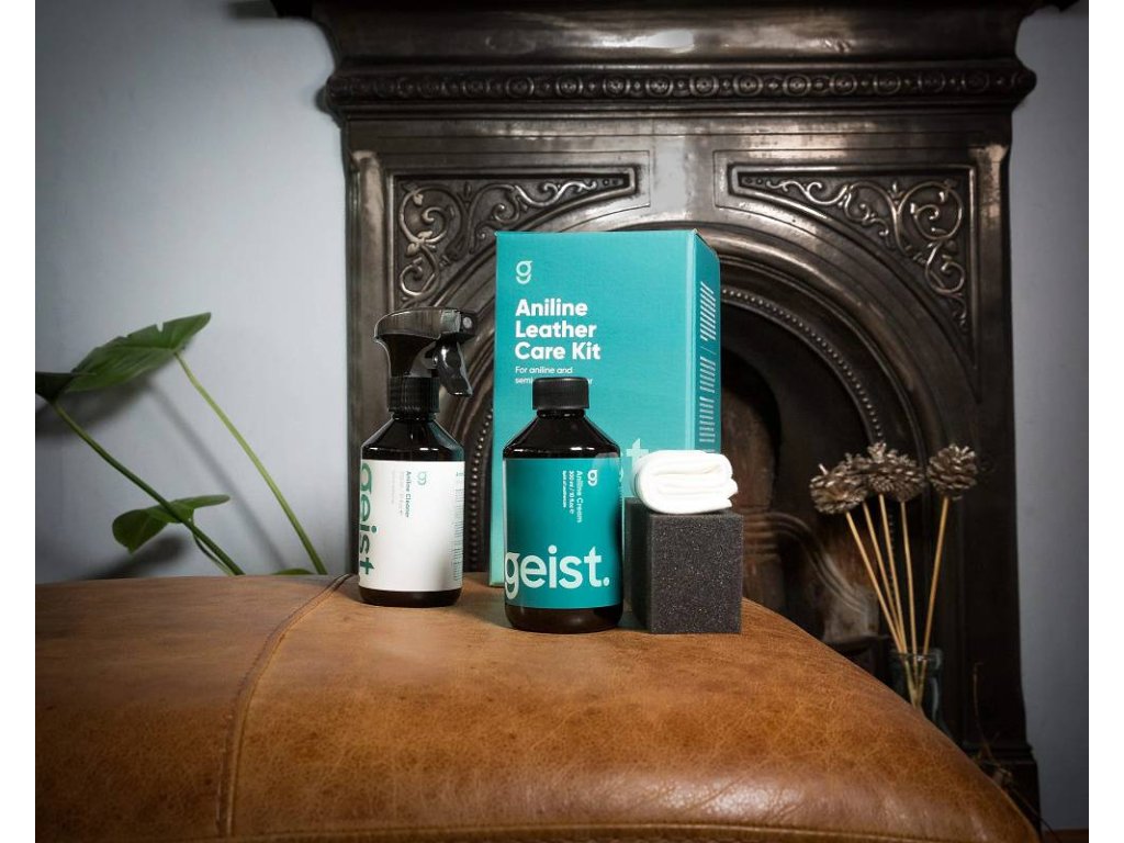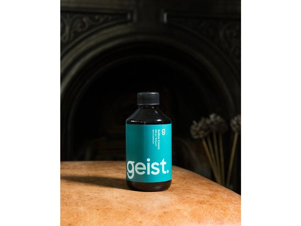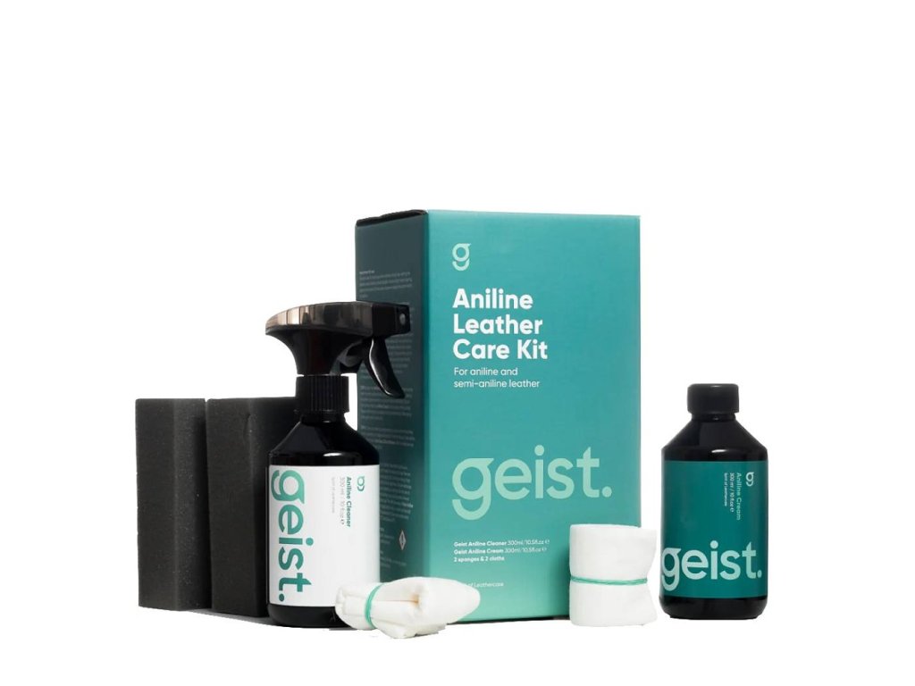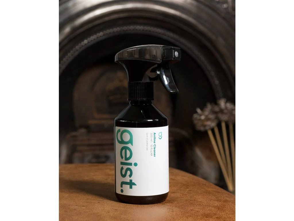 Krok 1: Geist. Aniline Cleaner se dodává v lahvičce s rozprašovačem a funkcí pěnění. Zkontrolujte, zda je rozprašovací hlavice nastavena na funkci pěnění, a poté nastříkejte pěnu na vlhkou houbičku (součástí dodávky) nebo vlhký hadřík. Nestříkejte čistič přímo na kůži. Rovnoměrně setřete povrch pěnou a houbičkou, zejména kontaktní oblasti (sedák, loketní opěrka a opěrka hlavy), abyste odstranili pot a mastnotu. Pracujte od švu ke švu a vyhněte se silnému namočení povrchu. Netřete silně a pěnu ihned setřete suchým ručníkem. Nikdy nečistěte anilinovou kůži na přímém slunci a nechte ji pomalu uschnout. Pokud skvrny zůstanou, netřete, ale znečištěné místo jemně ohýbejte nebo natahujte čistýma rukama. Vlákna kvalitní anilinové kůže se natáhnou a lehké skvrny často zmizí. Hlubší skvrny časem sníží svou intenzitu nebo zmizí.