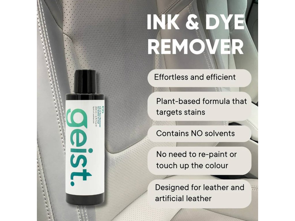 Geist Ink & Dye Remover je silný odstraňovač inkoustu a barviv pro kůži, PVC a PU. Jeho přírodní složení bez rozpouštědel zajišťuje bezpečné a efektivní čištění bez poškození povrchů. Snadno se aplikuje a chrání povrchy před budoucím zabarvením. Ideální pro domácnosti i auta.