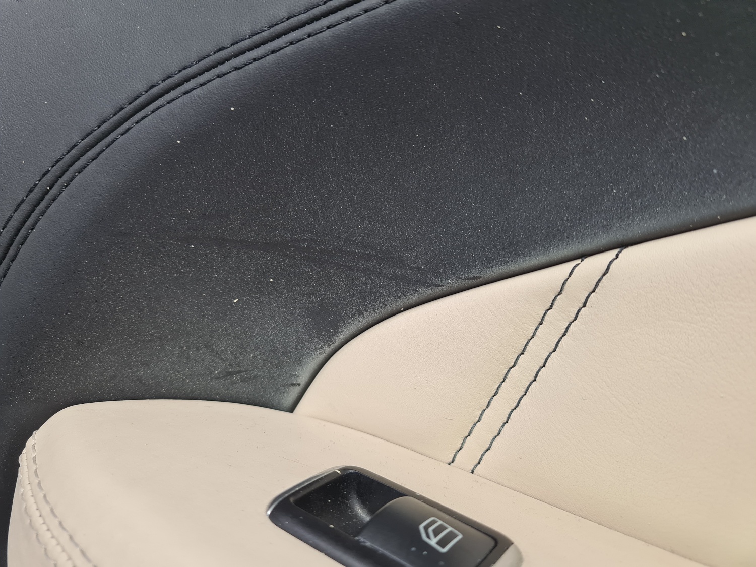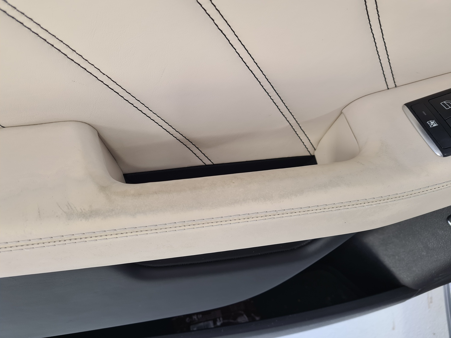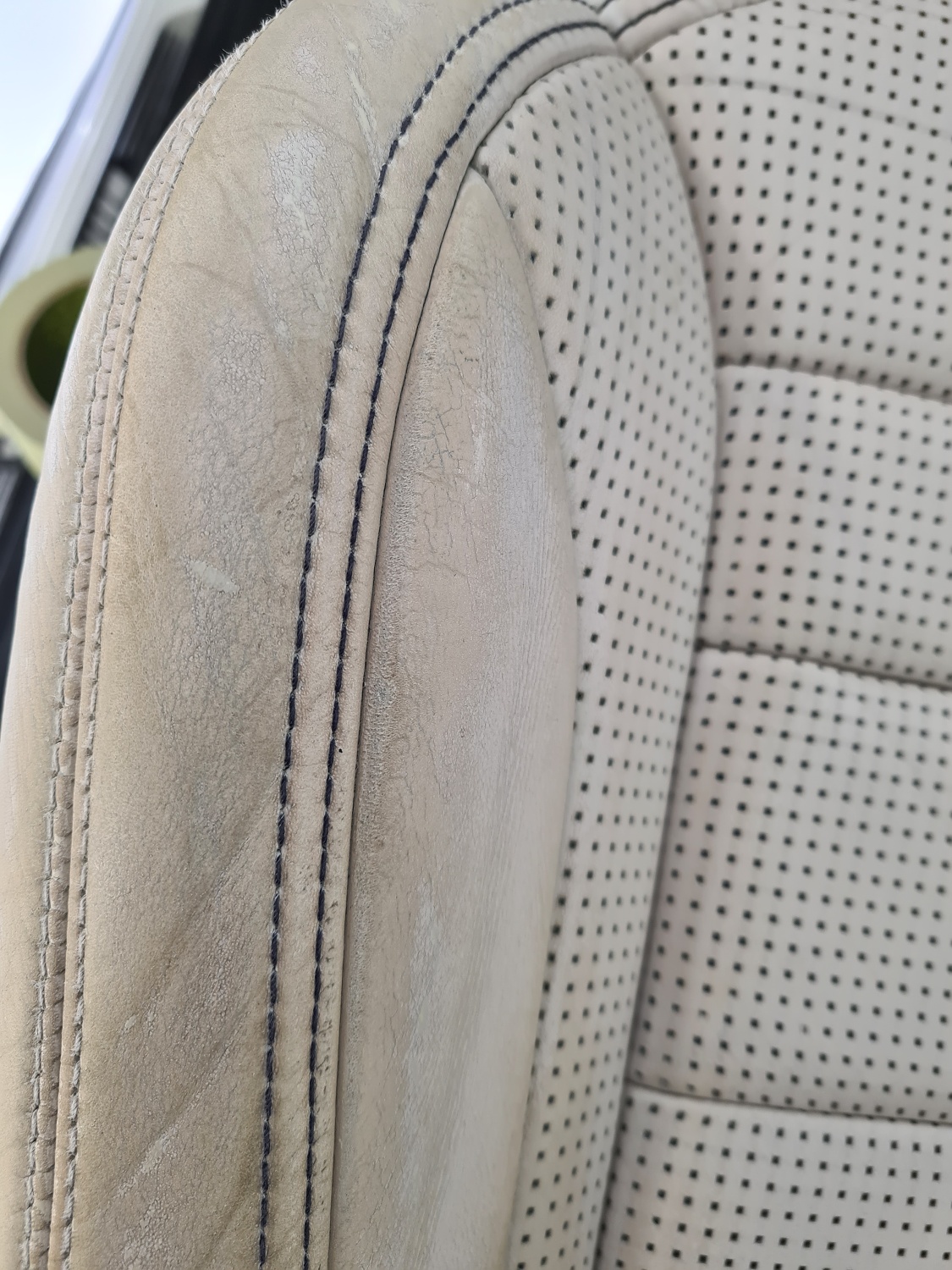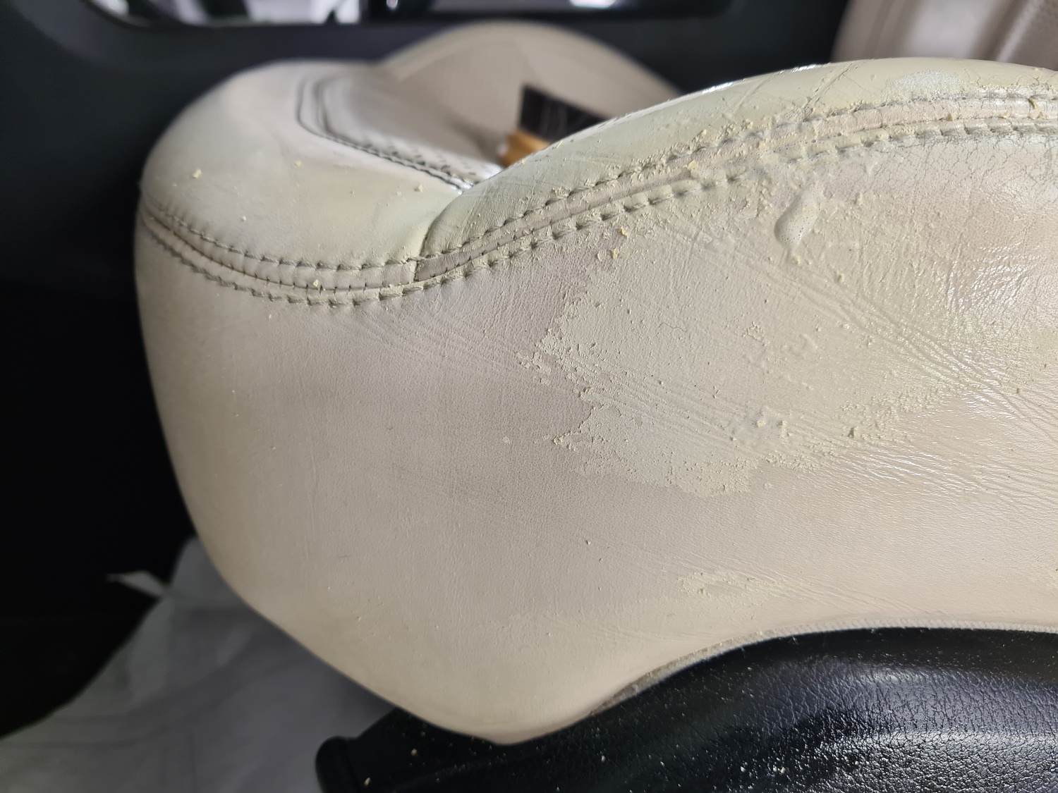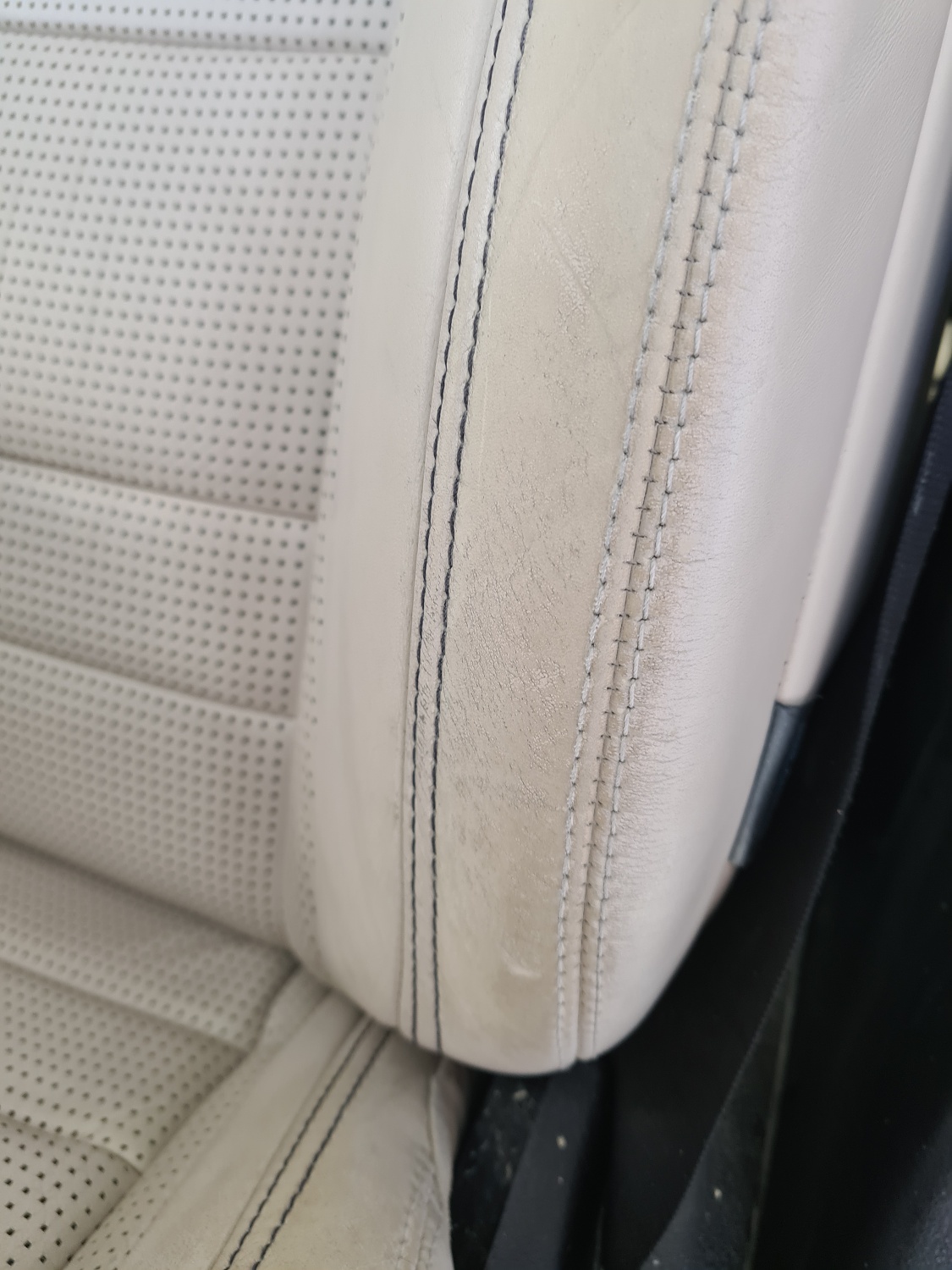 Hlavním úkolem u tohoto auta byla renovace kožených částí interiéru. Zejména přední část interiéru byla ve špatném stavu - opotřebení madel dveří, středové opěrky a předních sedadel bylo velmi neodborně zamaskováno nástřikem barvy. Výsledkem byl popraskaný a špinavý nástřik barvy, loupající se barva, stékance, zástřiky na okolních plochách (černé plastové díly, černá kůže).