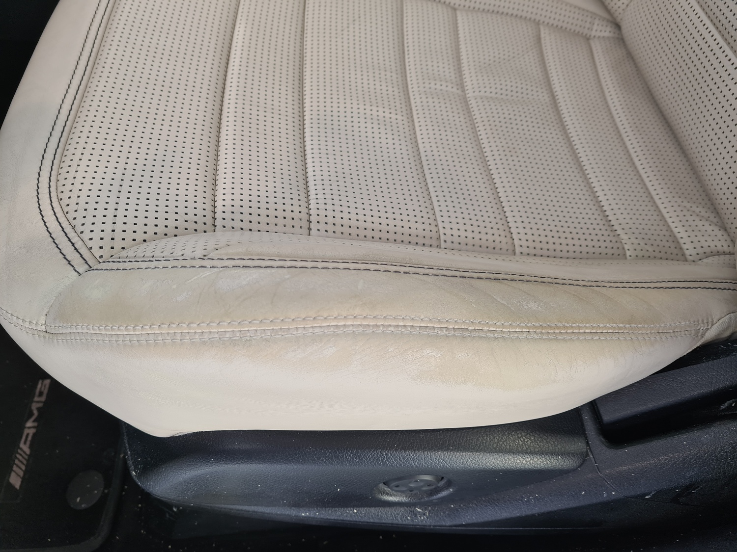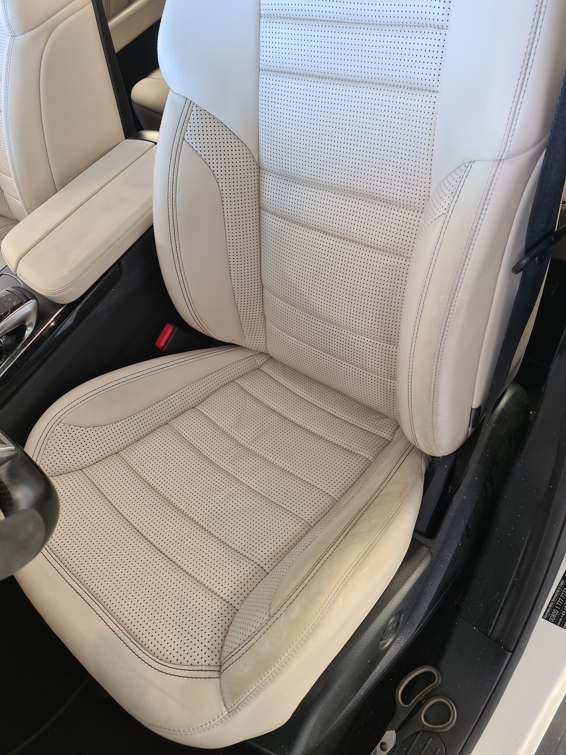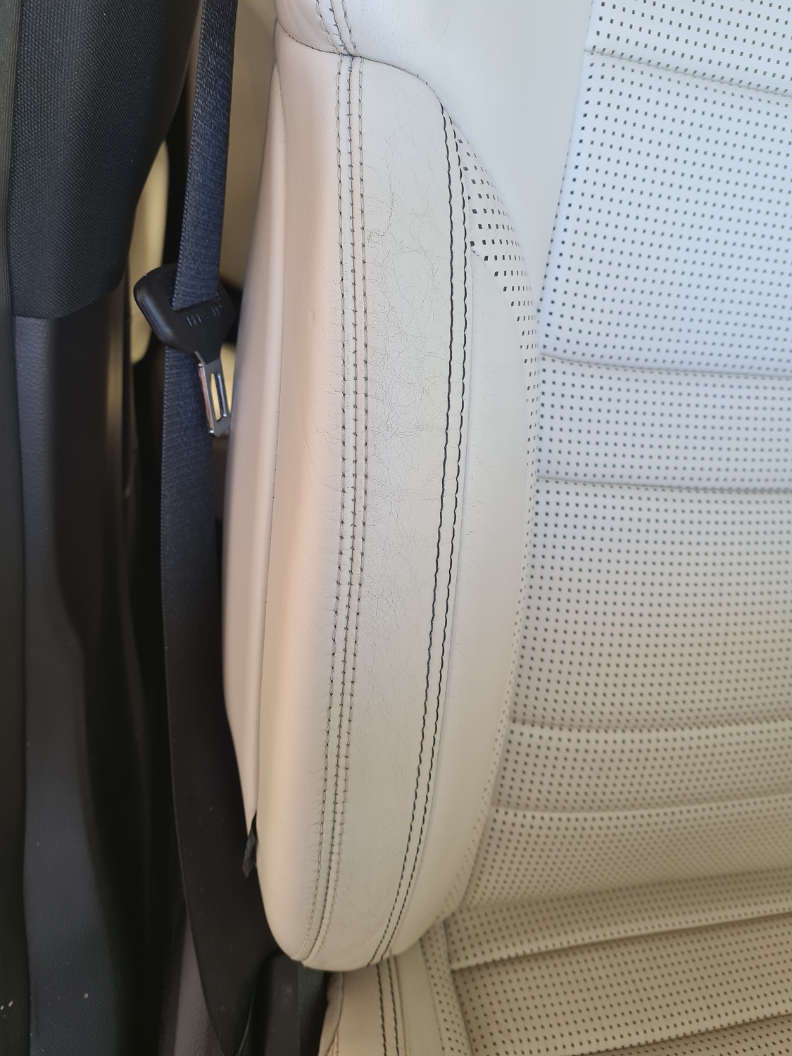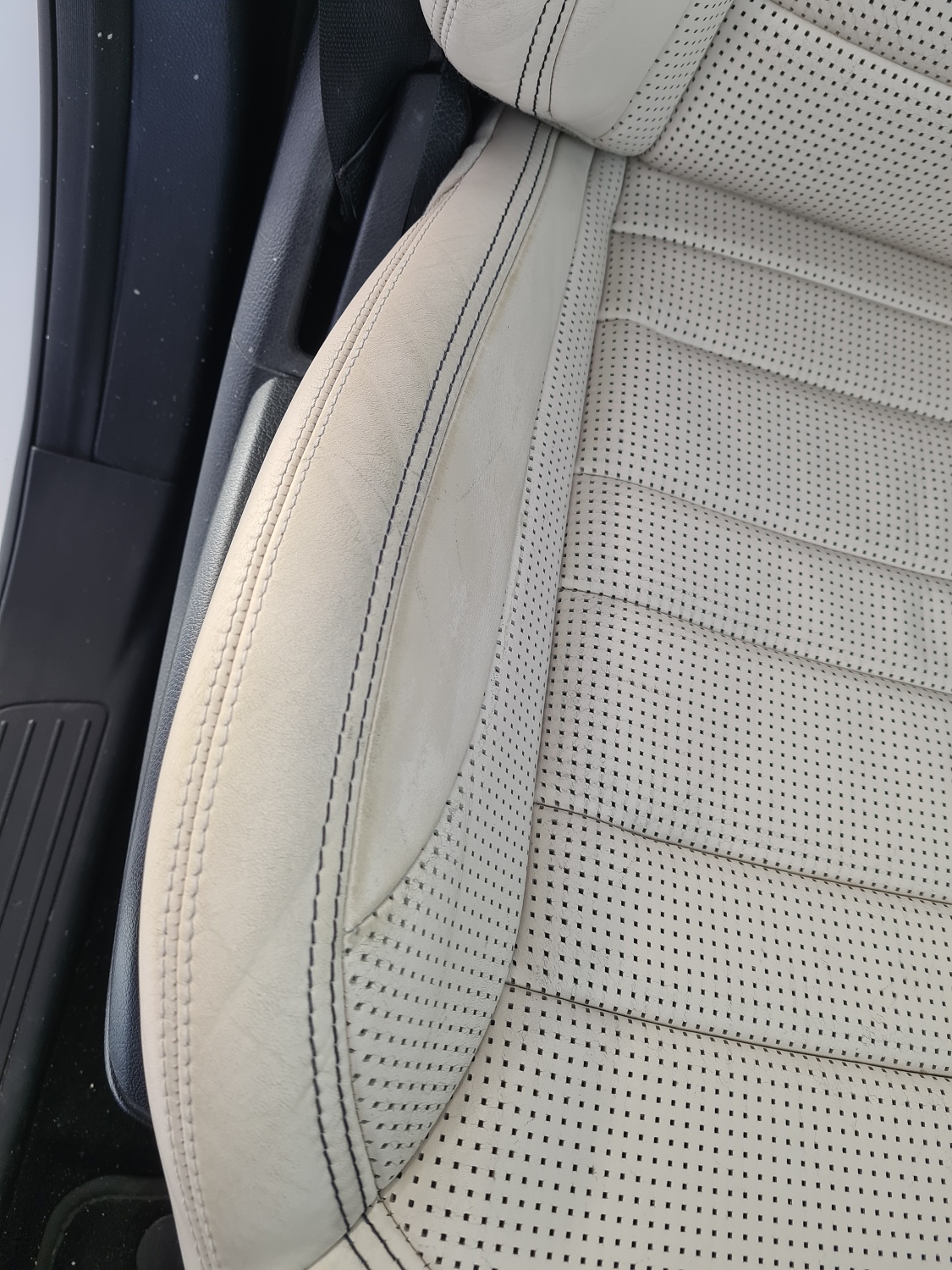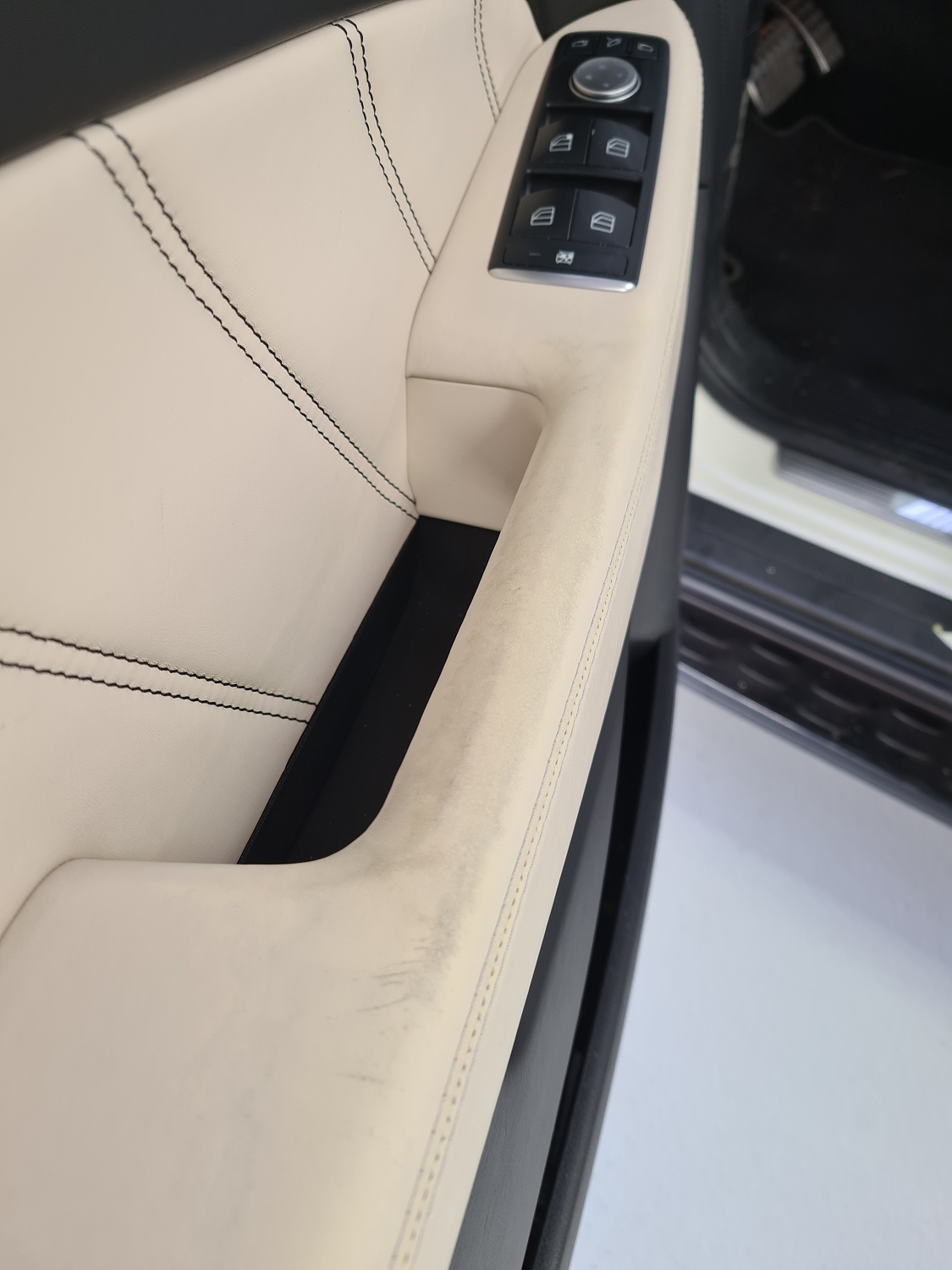 Hlavním úkolem u tohoto auta byla renovace kožených částí interiéru. Zejména přední část interiéru byla ve špatném stavu - opotřebení madel dveří, středové opěrky a předních sedadel bylo velmi neodborně zamaskováno nástřikem barvy. Výsledkem byl popraskaný a špinavý nástřik barvy, loupající se barva, stékance, zástřiky na okolních plochách (černé plastové díly, černá kůže).