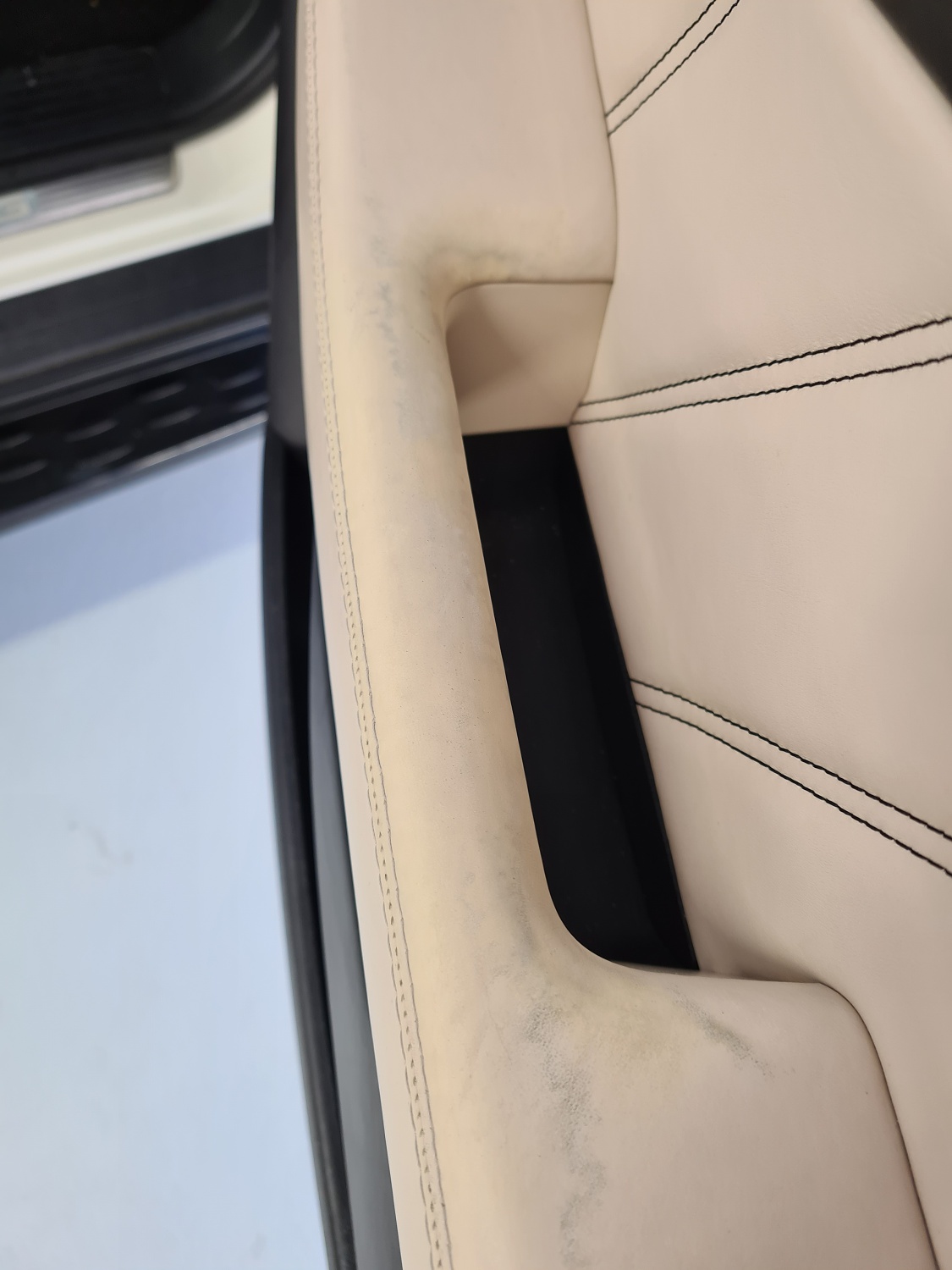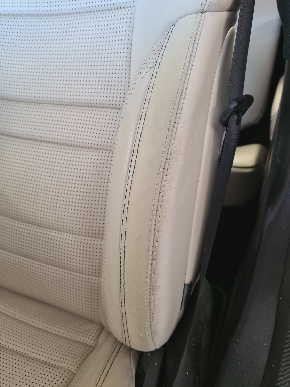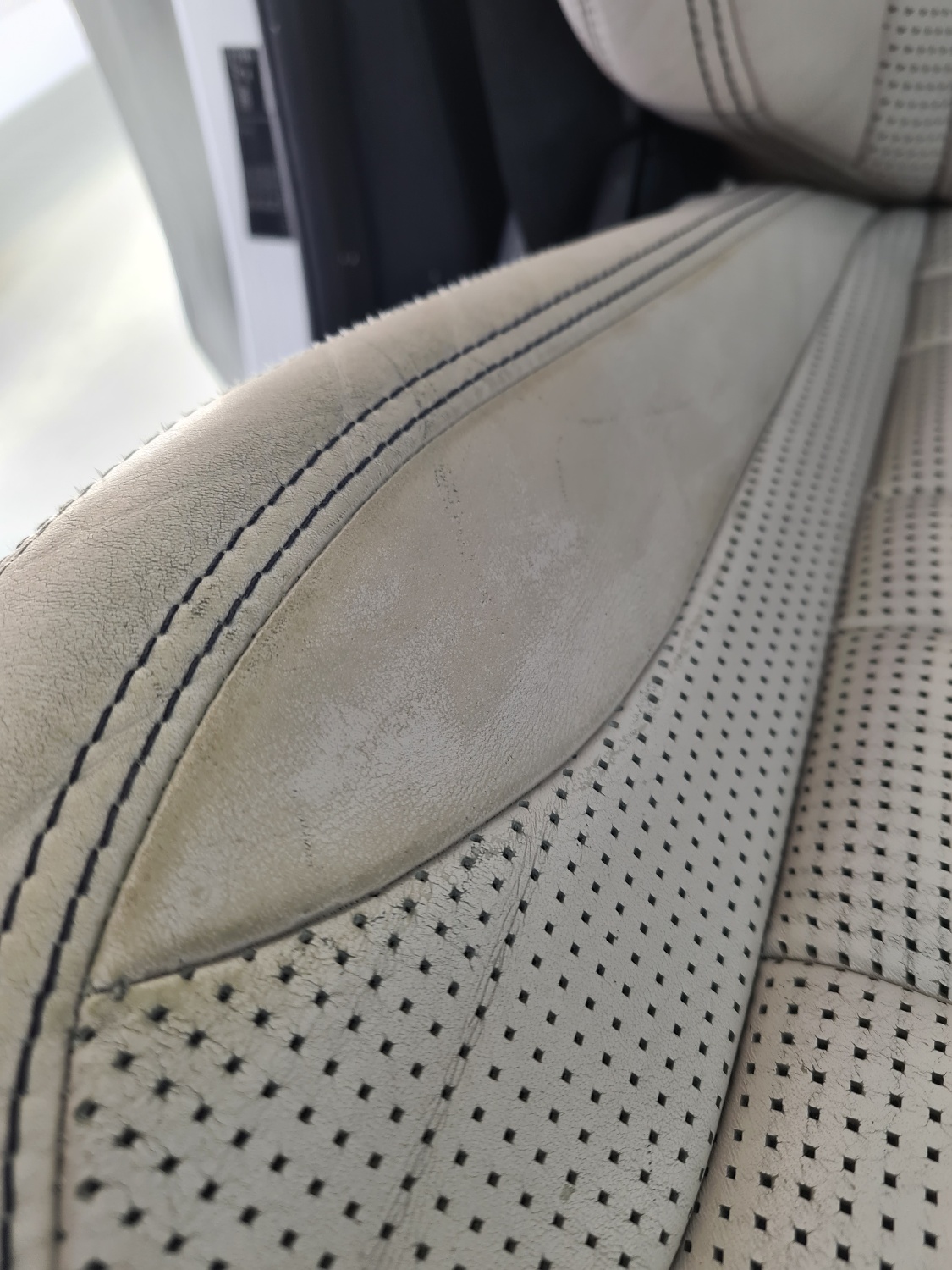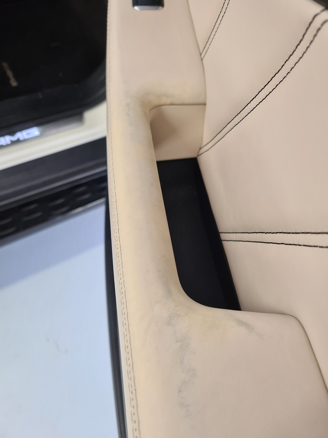 Hlavním úkolem u tohoto auta byla renovace kožených částí interiéru. Zejména přední část interiéru byla ve špatném stavu - opotřebení madel dveří, středové opěrky a předních sedadel bylo velmi neodborně zamaskováno nástřikem barvy. Výsledkem byl popraskaný a špinavý nástřik barvy, loupající se barva, stékance, zástřiky na okolních plochách (černé plastové díly, černá kůže).