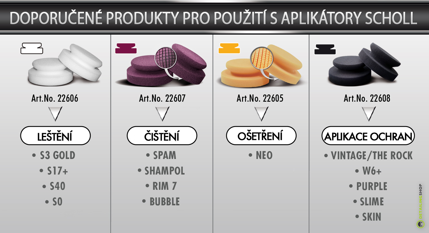 Jednotlivé aplikátory lze částečně zaměňovat, např. tvrdší kotouče lze použít k ručnímu leštění a měkčí k nanášení impregnací, vosků nebo syntetických ochran. Zorientovat se můžete také podle tabulky tvrdosti a kompatibilních produktů Scholl.